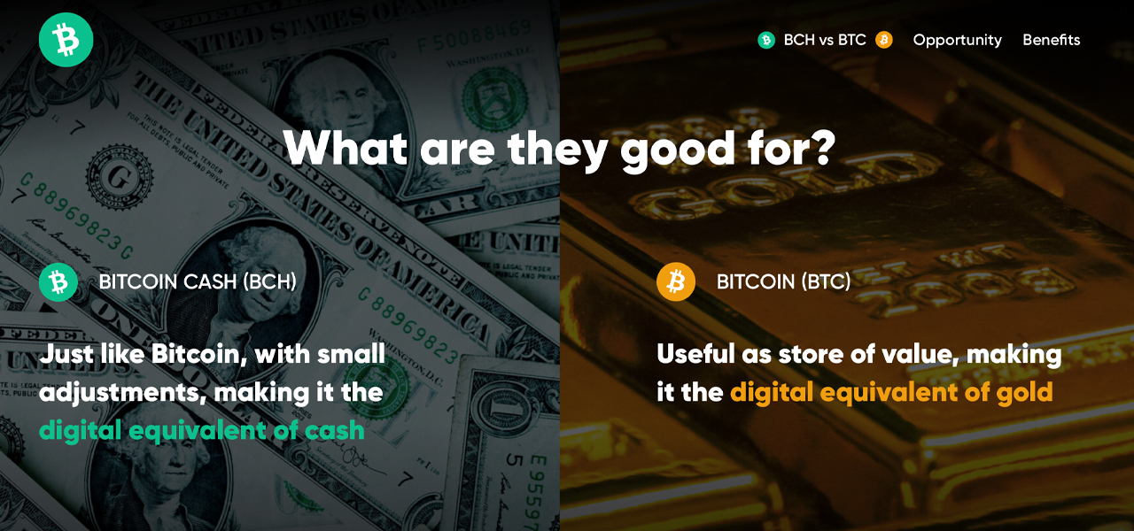 The website details how BTC can be considered the “digital equivalent of gold.” BCH, on the other hand, has stayed consistent with Satoshi Nakamoto’s white paper, which is a “purely peer-to-peer version of electronic cash.”