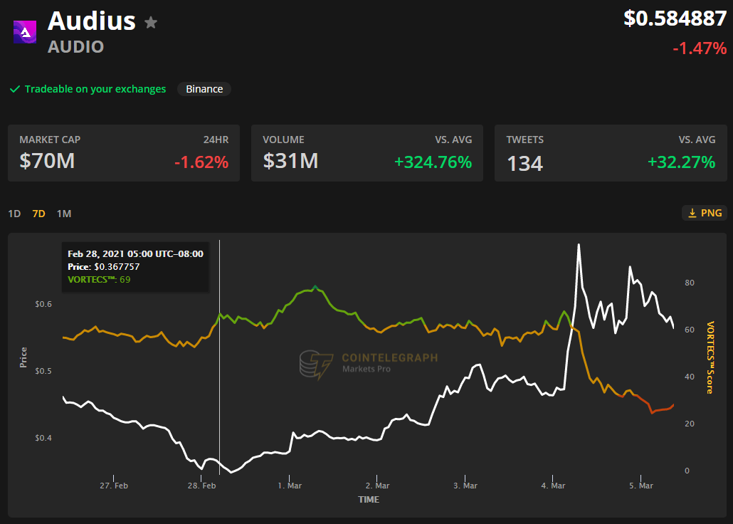 VORTECS™ data from Cointelegraph Markets Pro began to detect a bullish outlook for AUDIO on Feb. 28, prior to the recent price rise.