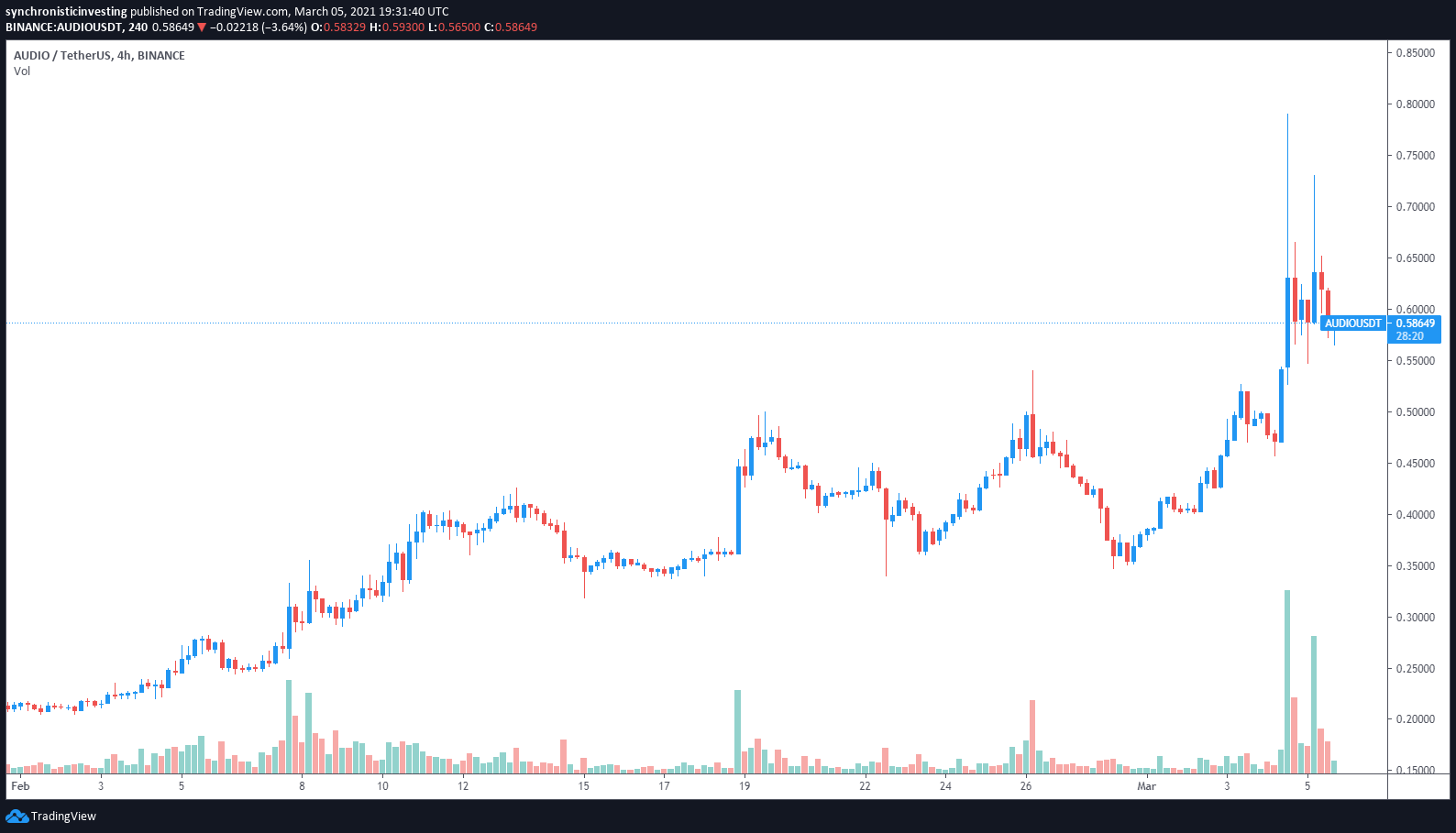 Data from Cointelegraph Markets and TradingView shows that the price of AUDIO surged 108% since the start of March from a low of $0.38 to a new all-time high of $0.79 on March 4 as the altcoin’s trading volume spiked from $3 million to a record $55 million.