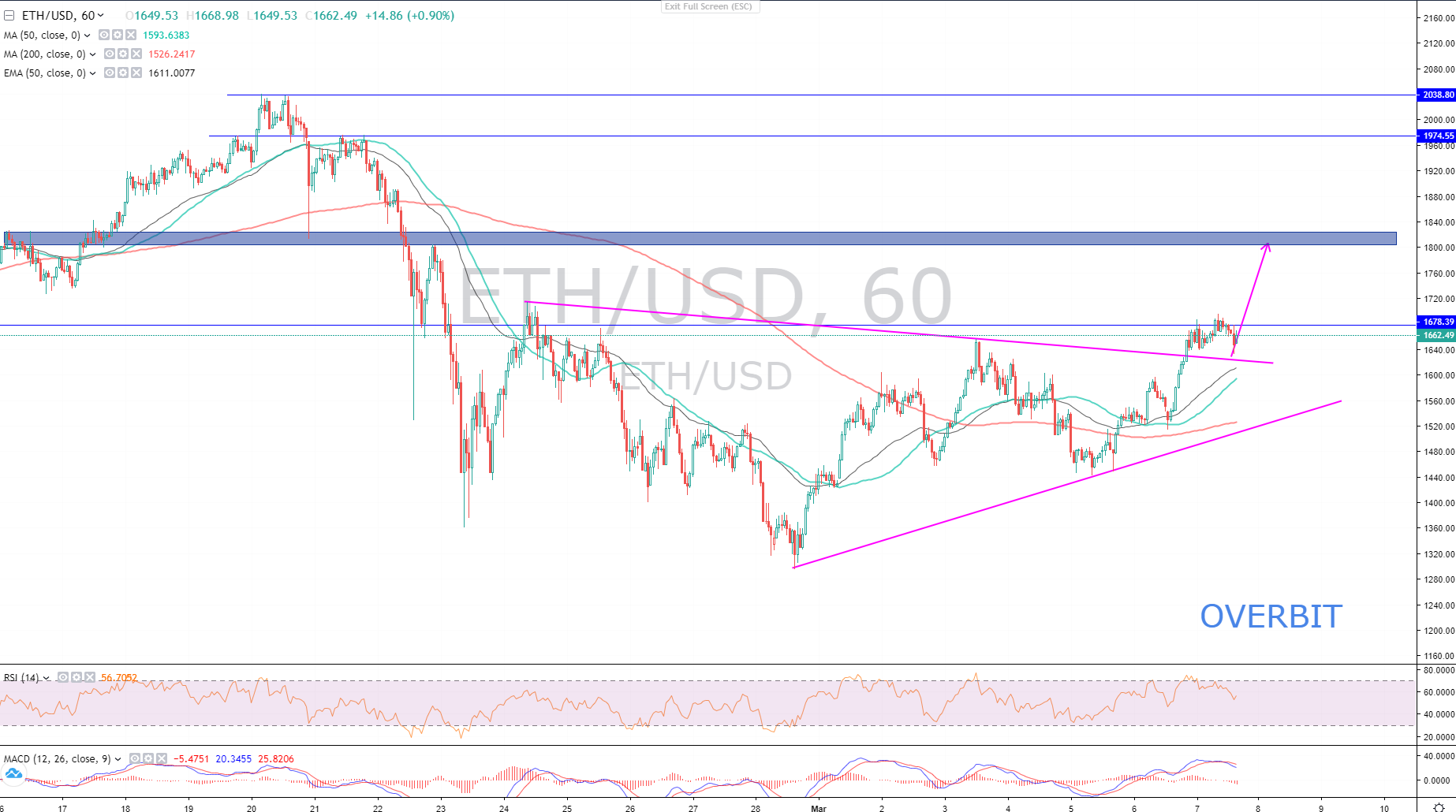 An hourly ETH/USD chart clearly demonstrates that Ethereum is on a bull phase. The pair has completed a breakout from the triangle, the move which supported the breakout is impulsive, the price retested the dynamic resistance as support. There is one obstacle to overleap at $1680 and Eth can advance upwards to test another strong resistance area laid at $1805 – $1825 area.