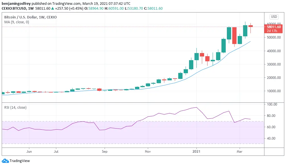On the weekly BTC-USD chart as seen on TradingView, the 9-day Moving Average is bullish, showing a clear bullish run from the low of October 2020.