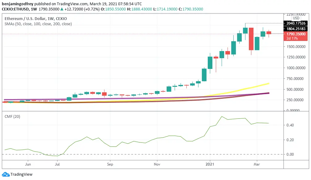 On the weekly ETH-USD chart as seen on TradingView, both the Chaikin Money Flow technical indicator and the closure of the coin above the 50, 100, and 200 Moving Averages is a bullish enough marker to maintain confidence in the longer-term prospect of Ethereum.