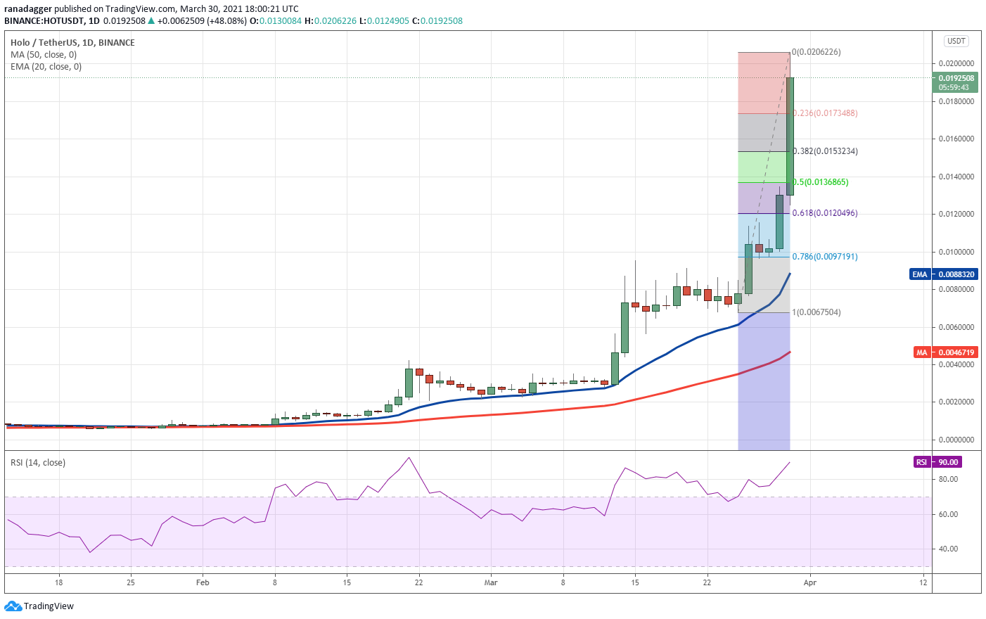 Holochain HOT token was featured on Cointelegraph on Feb. 25 when the price was at $0.0030. Since then, the token has skyrocketed to an intraday high at $0.0206 today, a gain of 586% in just over a month.