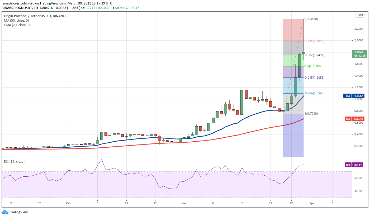 OGN price has been on a tear in the past few days. It went from $0.75 on March 25 to an intraday high at $2.36 today, clocking a 214% return in less than a week. However, traders seem to be in a profit-booking mode today as seen from the long wick on the day’s candlestick.