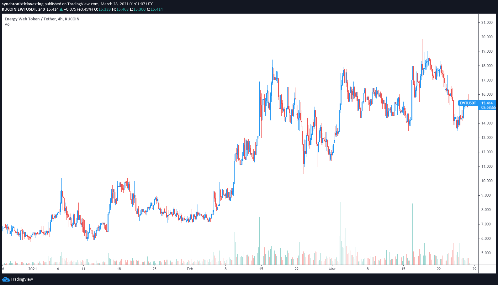 One of the biggest price movers for EWT in 2021 came at the beginning of March when the token was listed on the U.S.-based Kraken cryptocurrency exchange.