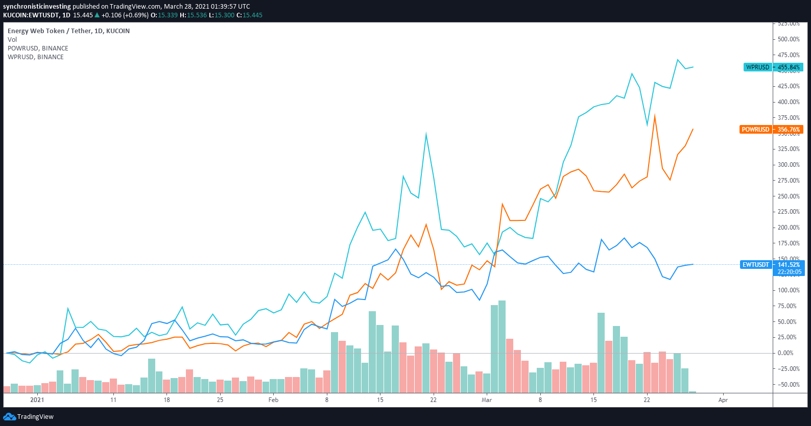 Three energy-focused projects that have seen triple-digit gains since the beginning of 2021 are Energy Web Token (EWT), Power Ledger (POWR) and WePower (WPR).
