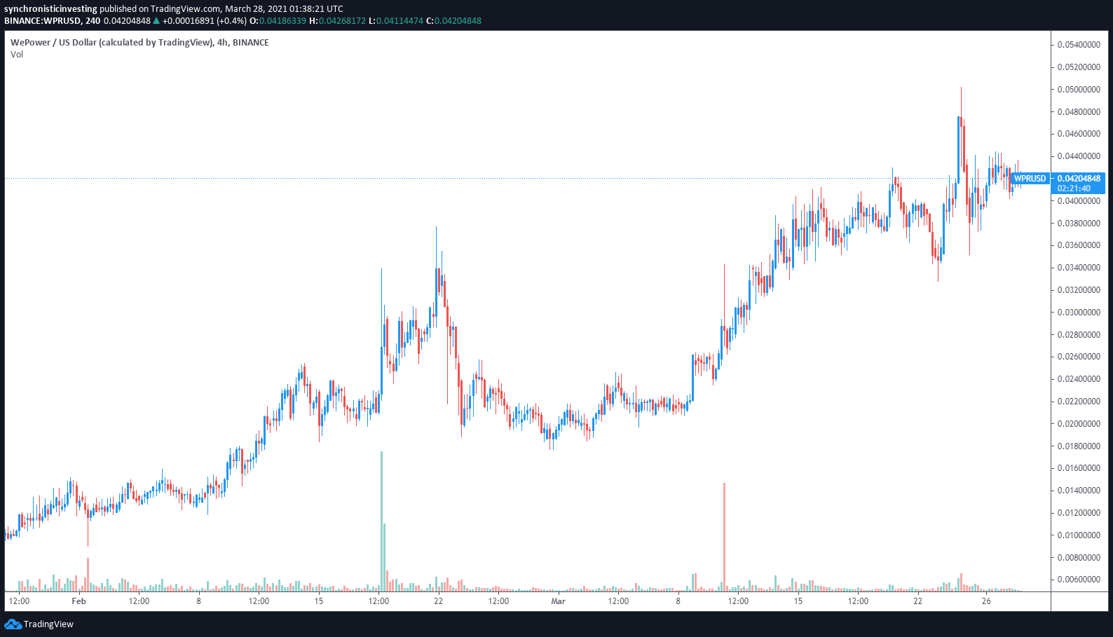 Following the launch of the Elemental retail marketplace on Feb. 1, the price of WPR surged from a low of $0.011 to a high of $0.05 on March 24 as conversations concerning renewable energy and sustainability in Europe and Australia took place.