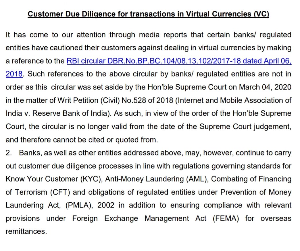 It has come to our attention through media reports that certain banks/ regulated entities have cautioned their customers against dealing in virtual currencies by referring to the RBI circular DBR.No.BP.BC.104/08.13.102/2017-18 dated April 06, 2018. Such references to the above circular by banks/ regulated entities are not in order as this circular was set aside by the Hon’ble Supreme Court on March 04, 2020, in the matter of Writ Petition (Civil) No.528 of 2018 (Internet and Mobile Association of India v. Reserve Bank of India). As such, given the order of the Hon’ble Supreme Court, the circular is no longer valid from the date of the Supreme Court judgment, and therefore cannot be cited or quoted from.