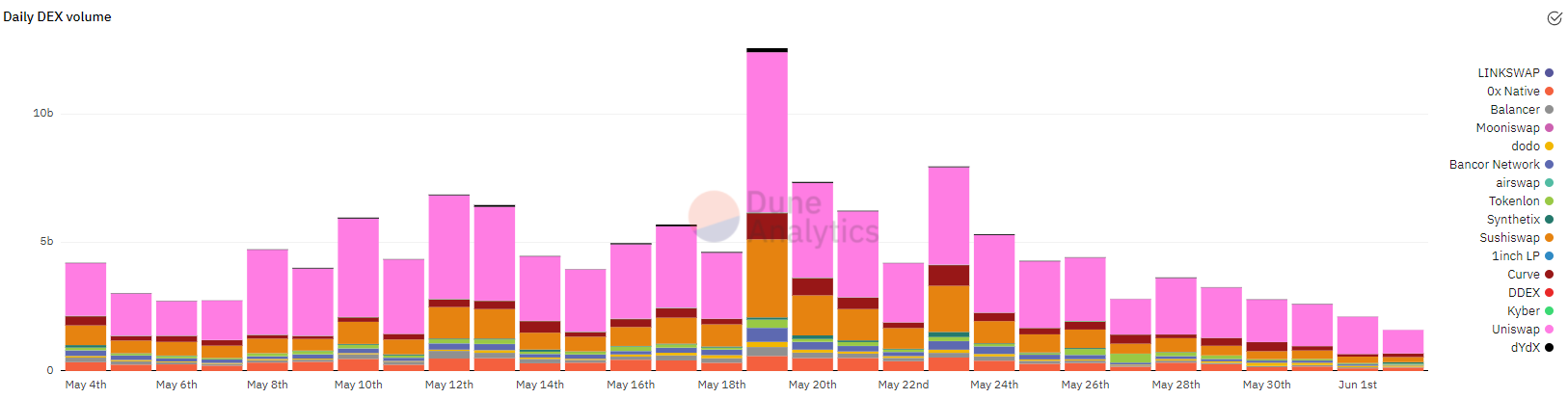 In less than a year, Uniswap evolved into the top DEX serving the crypto community, seeing an all-time record of $5.74 billion in 24-hour trading volume during the market sell-off on May 19 and $5.37 billion in total volume locked on the platform.