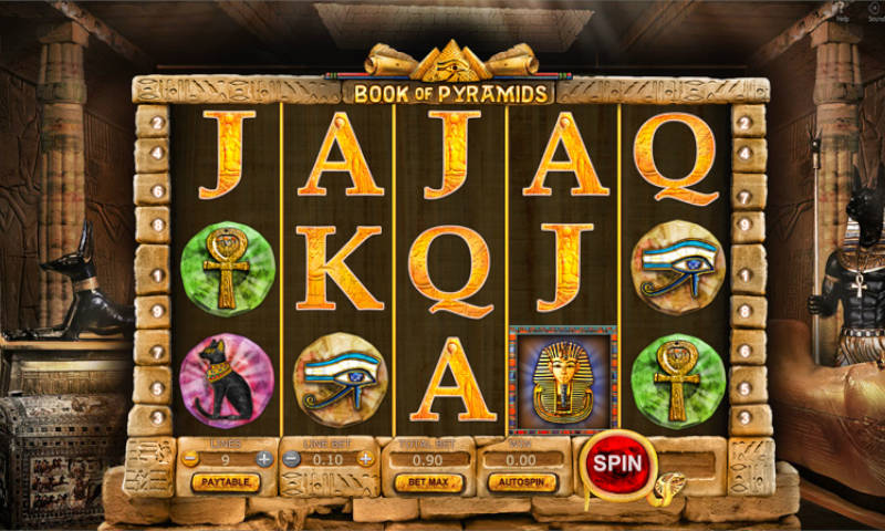 This 5-reel, 3-row, and 9-payline video slot has an Ancient Egypt theme. Egyptian artifacts and hieroglyphic symbols like pyramids, tombs, the Eye of Horus, the Eye of Rah, the Bastet cat, pharaohs, the scarab symbol (for the scatter), the Ankh, and Egyptian headrests. All available on major devices such as PC desktops and notebook laptops as well as mobile devices like tablets and smartphones.