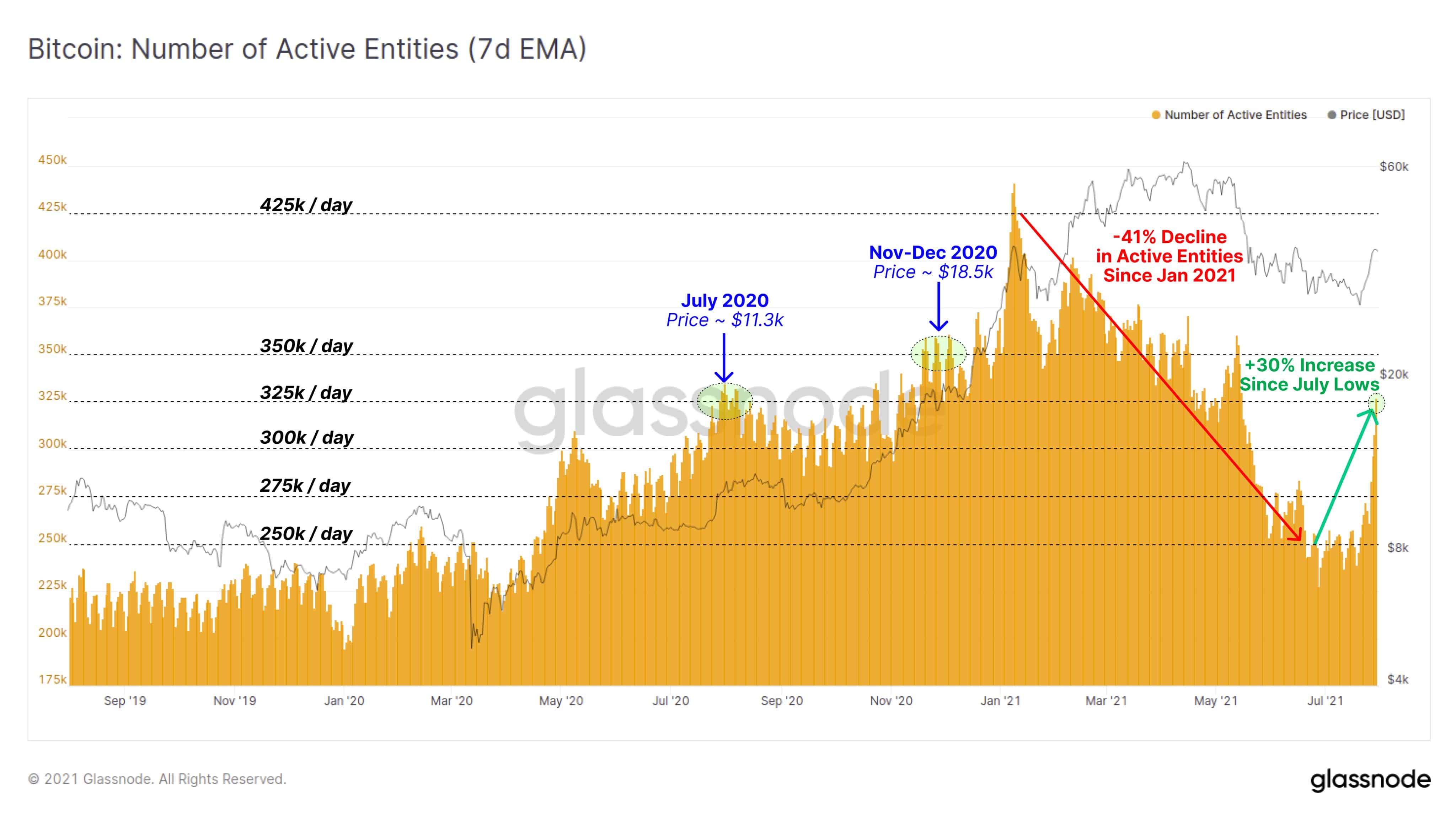 “Bitcon has seen a resurgence in Active Entities over the past week, rising by 30% from 250k to 325k active entities per day. This degree of activity was sustained in July 2020 when $BTC prices were around $11.3k in Q2-2020″.