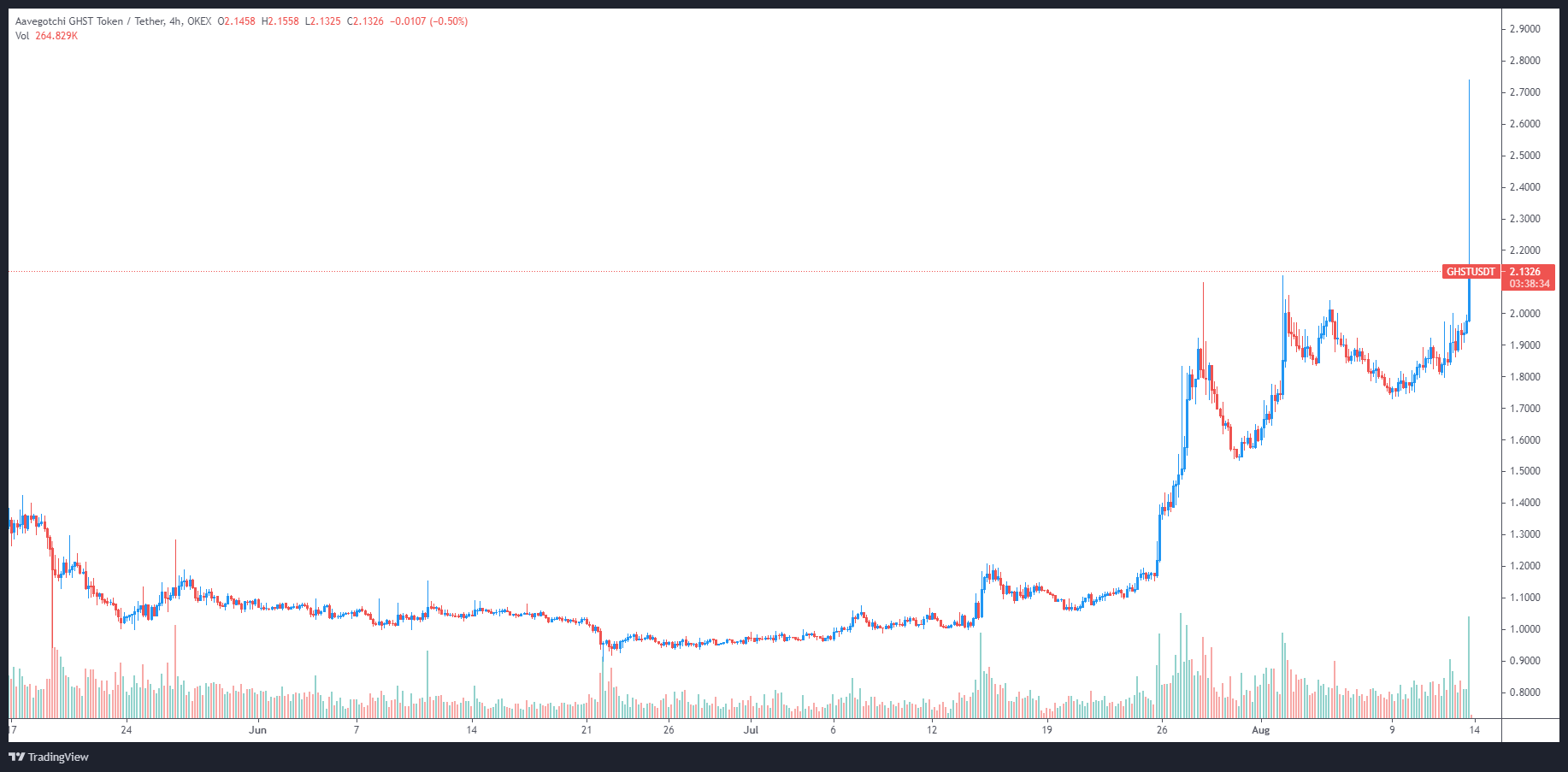 Data from Cointelegraph Markets Pro and TradingView shows that since reaching a low of $0.896 on June 22 the price of GHST has rallied 202% to reach a new record high at $2.74 on Aug. 13.
