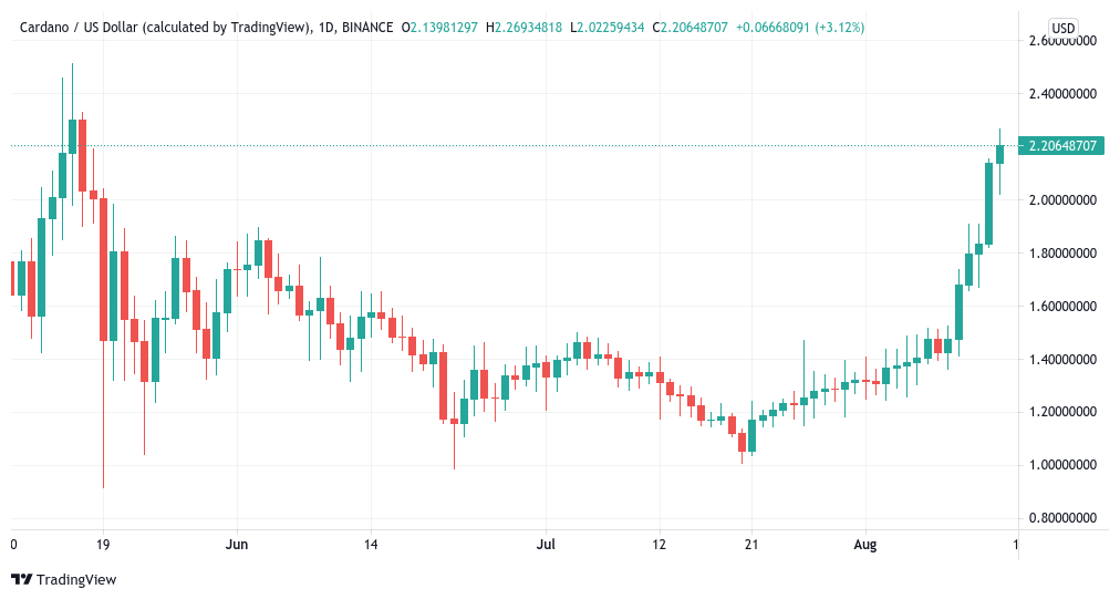 After cementing $2 support, ADA/USD thus went on to hit its highest levels since mid May, when it came off $2.50 all-time highs amid a sea of change in Bitcoin.