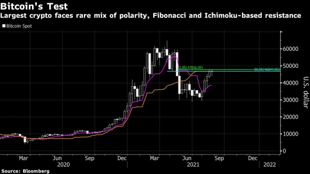“An April low of about $47,000 is now acting as something of a barrier, as is a Fibonacci and Ichimoku cluster between $47,000 and $48,000, while the 61.8% Fibonacci retracement of the April to June downtrend — at $51,000 — could be an obstacle too”.