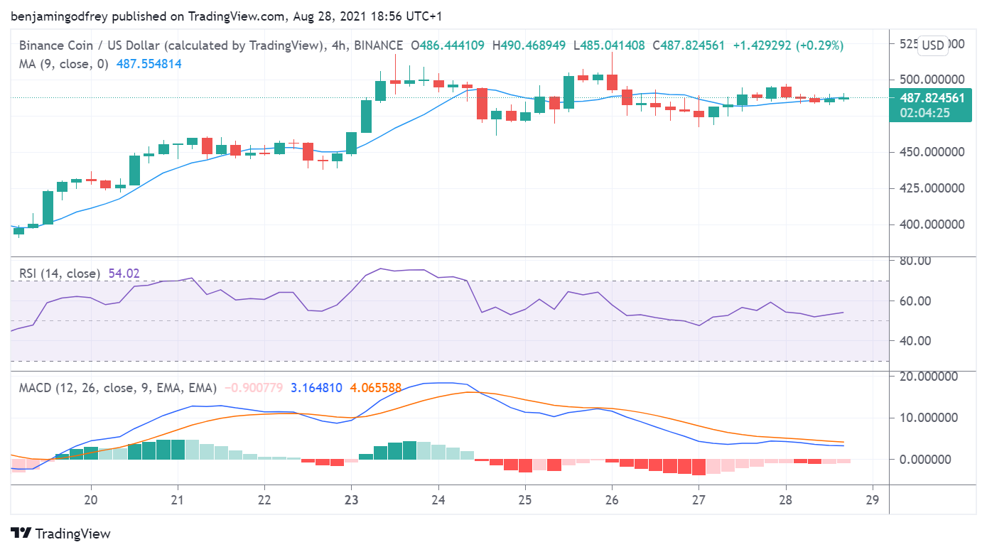 The BNB/USD 4h chart on TradingView showcases the flattening trend of the digital currency as it met with a stiff rejection at the $500 resistance point. The three technical indicators including the 9-Day Moving Average, the MACD, and Relative Strength Index (RSI) are trending horizontal, a show of the balance of power between the bulls and the bears.