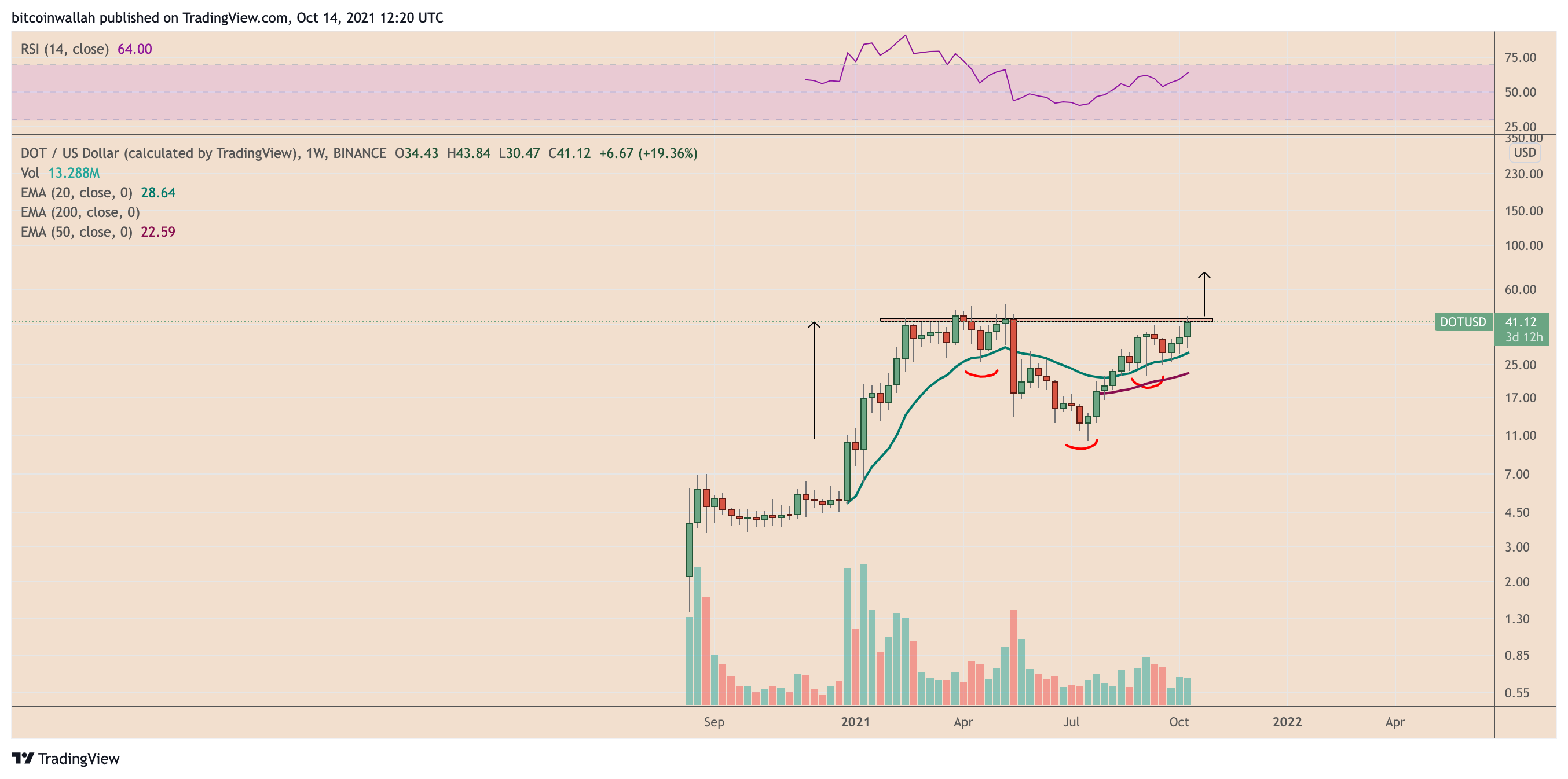 So, it appears that Polkadot has been forming a similar bullish pattern on its weekly chart, as shown below.