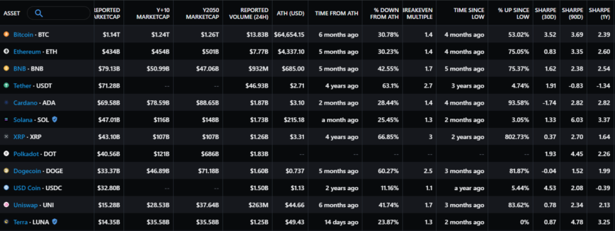 When choosing riskier assets for a portfolio, anything with a Sharpe ratio higher than Bitcoin and Ethereum is a potential candidate. Within the top 10 crypto assets by market capitalization, Solana and Terra have ratios of 3.37 and 3.25, respectively, with Cardano coming in third at 2.85.
