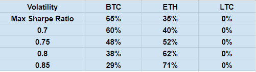 Unfortunately, the crypto space is both nascent and fast-moving, meaning that few assets with enough historical data are eligible for consideration. This analysis will use a portfolio of Bitcoin, Ethereum, and Litecoin to demonstrate the best risk-adjusted returns as these assets have the highest market capitalization with the most historical data. Using these three assets, the approximate best allocation for maximizing risk-adjusted returns comes out at 65% Bitcoin, 35% Ethereum, and 0% Litecoin.