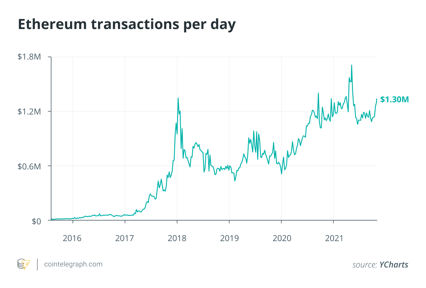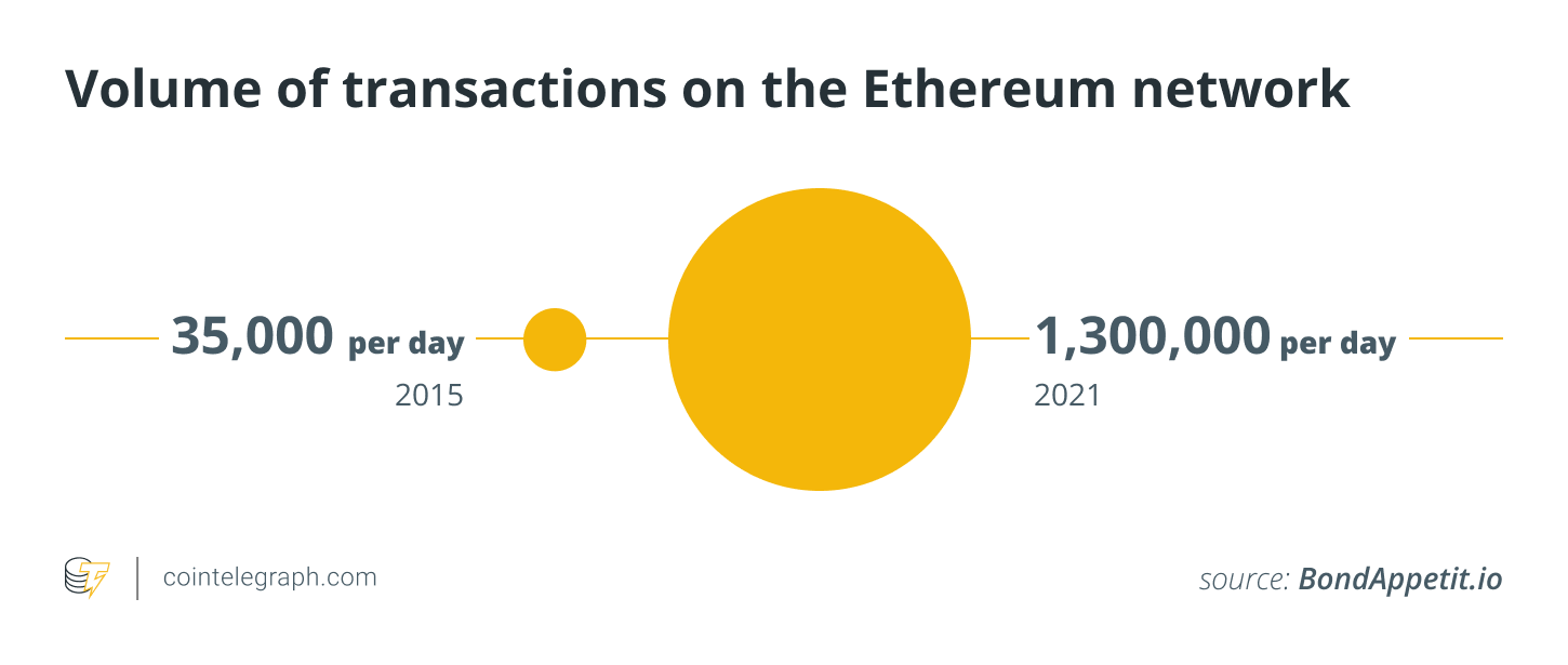 Transaction volume. Ethereum network processes over 1.3 million transactions each day in 2021, encompassing remittance, trading, lending, borrowing and various other types of transactions. This is a tiny number as compared to over 1 billion daily global credit card transactions, and the around 5.5 billion daily trading volume in NASDAQ. Capturing 1% of the credit card transactions on the Ethereum chain is at least 8x-ing its current volume.