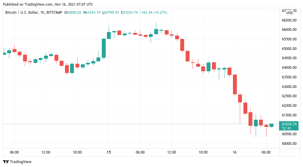 Bitcoin (BTC) extended its slide on Nov. 16 as BTC price action returned to test $60,000.