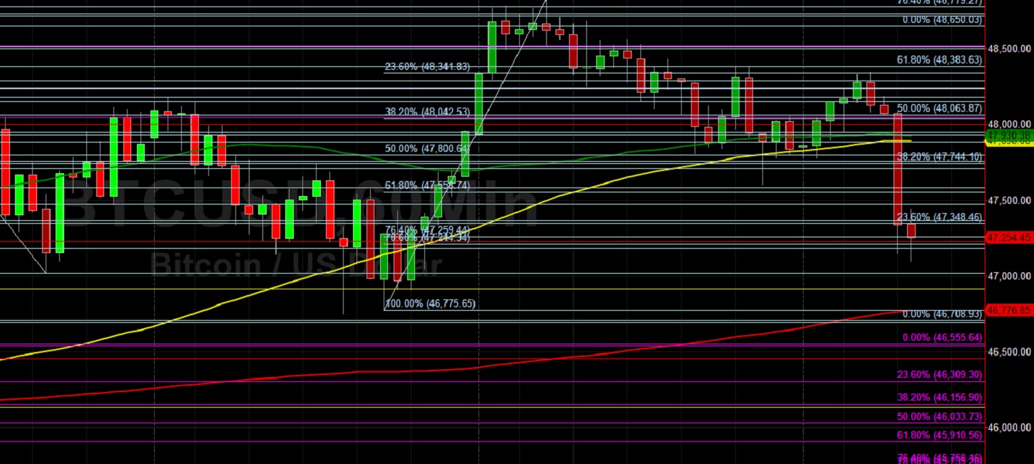 Bitcoin (BTC/USD) added to its recent pullback early in the Asian session as the pair depreciated back below the 47500 level after encountering technical resistance around the 48346.73 level during the European session, with the interday high representing a test of the 23.6% retracement of the appreciating range from 46752.67 to 48825.62. Significant Stops were elected below the 47800, 47558, 47259, and 47214 levels during the depreciation, representing the 50%, 61.8%, 76.4%, and 78.6% retracement levels of the recent appreciating range from 46775.65 to 48825.62. Traders are carefully monitoring technical support around the 46694 level, representing the 38.2% retracement of the depreciating range from 52944.36 to 42830.77.